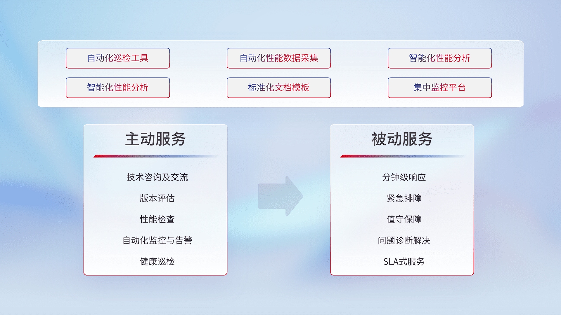 智能化工具和标准化文档,,,,保障服务质量,,,,提供主动服务(包含技术咨询、、、版本评估、、、性能检查、、、自动化监控与告警、、健康巡检)和被动服务包含(分钟级响应、、紧急排障、、、、值守保障、、、问题诊断解决、、、、SLA服务)。。。。
